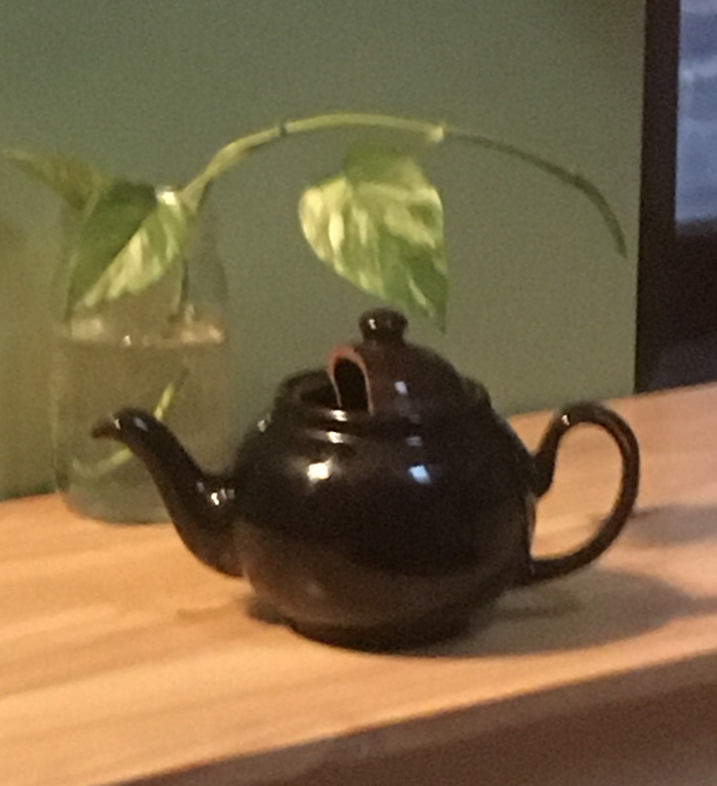 The teapot was sitting on my countertop, with the cutting from a plant in a jar of water behind it. I had a flash of inspiration. I was absorbed by the circular nature of the scene. Like the snake-eating-its-own-tail thing, yin-yang, circle of life, whatever. Symbolism aside, I really liked the way the vine made a circle with the curved base of the teapot. I also thought that I could do something with the leaves and the teapot handle. Sort of a repeated similar shape.