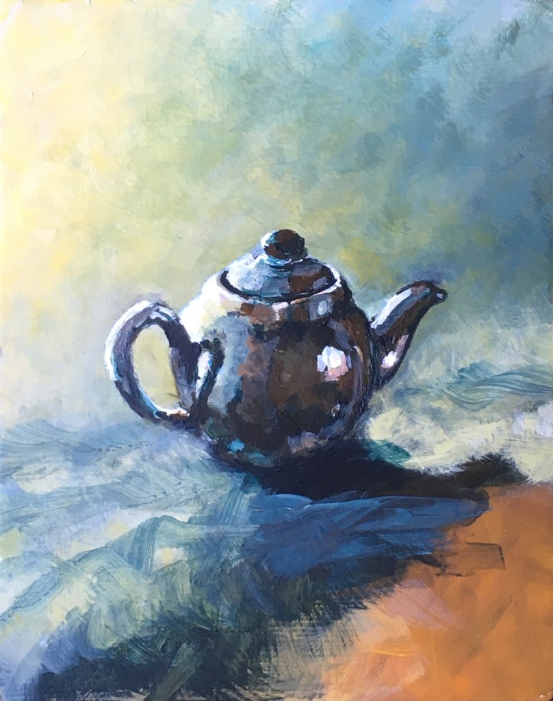 For this month’s installment, I offer three (3) smaller paintings. Yes, three images of this same broken teapot. I hope to conclude my teapot phase now, and to never again paint this teapot.