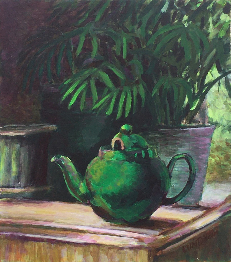 As usual, I painted this from a photo. That’s super helpful for getting perspective and proportions right. But for this painting, the colors and lighting are mostly from my imagination. For one thing, the darned teapot isn’t green in real life. Also, the light shining in from the left is a figment of my imagination.